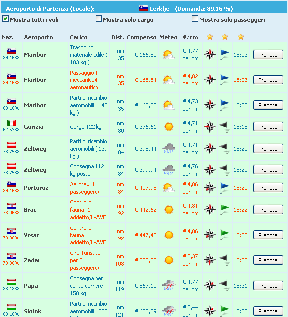 Ordinamento delle destinazioni e filtriQuando assegni un volo ad un aereo di tipo remunerativo, potrai ordinare dinamicamentel'elenco per tutte le voci che trovi nelle intestazioni delle colonne (nm, compenso, ecc). Inoltre puoi filtrare i voli mostrando solo i cargo o solo i passeggeri.